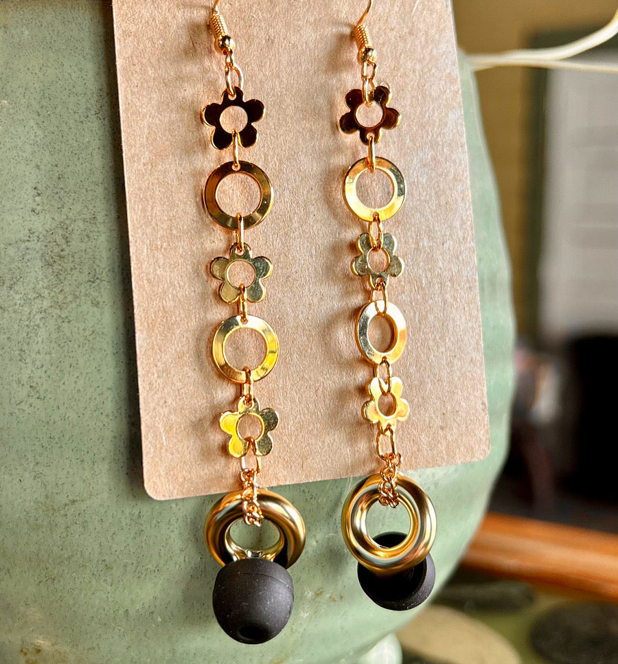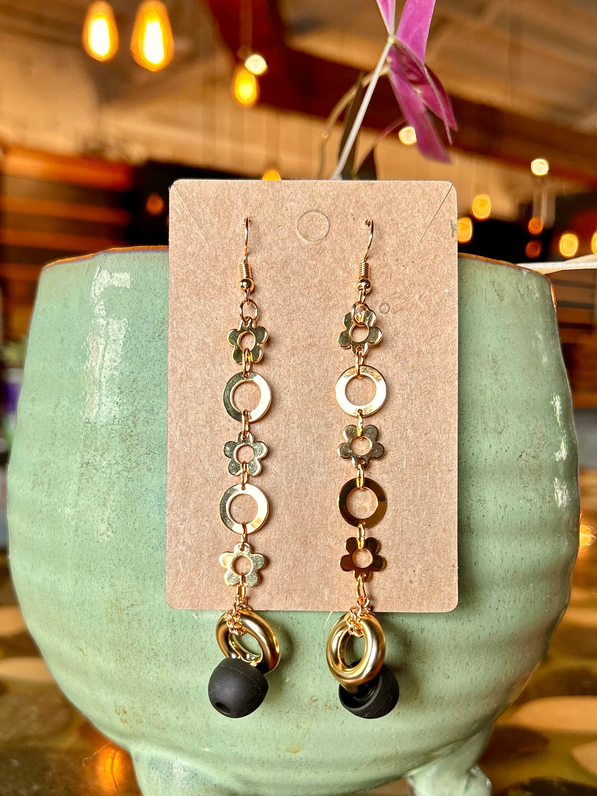 *Most Popular Design* Golden Daisy Ear Plug Earrings. Golden flower chain with filtered ear plug for concerts & live music. Each pair comes with container and adjustable ear plug sizes.